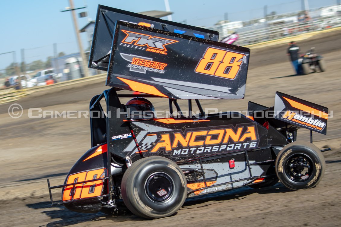 Looking for a better night on Saturday, the Ancona Racing team took the DRYCO Construction, CS9 Chassis, Factory Kahne No. 88A over to Lemoore for the second night of their doubleheader. The #2 would serve as the number of the night for Ancona, as he timed in second with an 11.221, then finished second-from-second in the heat race, and concluded the night a second-to-second run in the main event. Rolling out the from the outside pole, Ancona quickly fell into the second spot and gave chase for the lead, but ultimately fell just short and claimed runner-up honors to end his weekend on a high note.